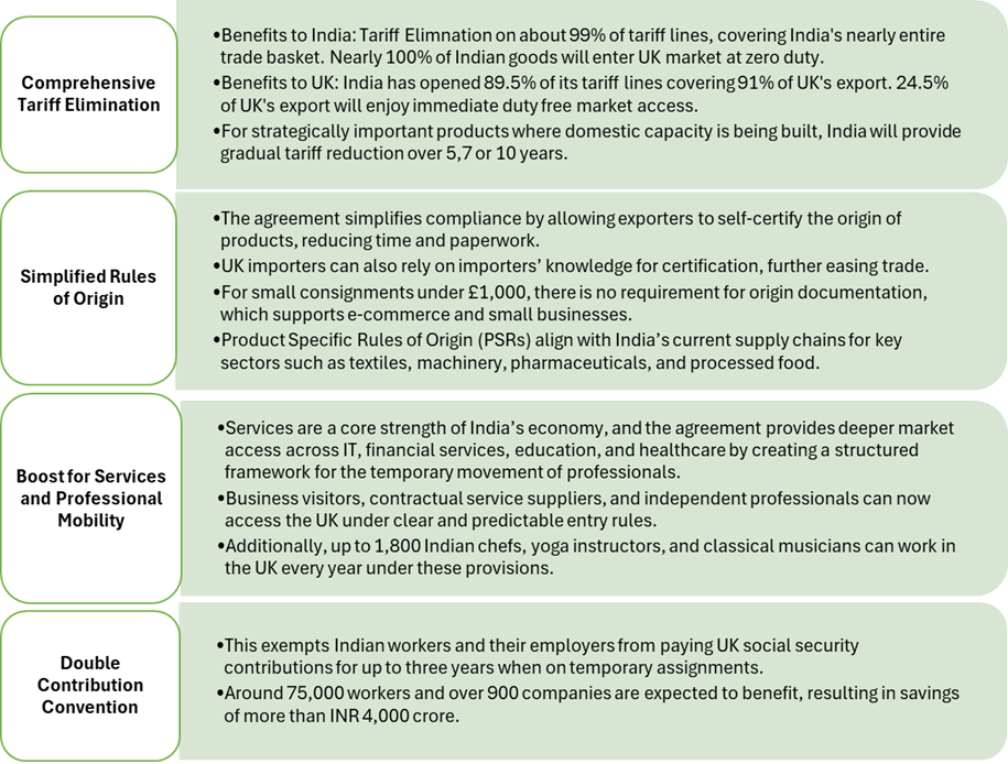 | Double Contribution Convention | Previously, Indian employees and their employers had to pay nearly 20 per cent of salaries to the UK’s National Insurance system during short-term assignments without receiving any benefits in return. Under the DCC, such dual contributions are eliminated for stays of up to 36 months, benefiting more than 75,000 Indian professionals and 900 companies. Industry estimates suggest this will result in annual savings of over USD 500 million, significantly improving the competitiveness of Indian firms operating in the UK. |